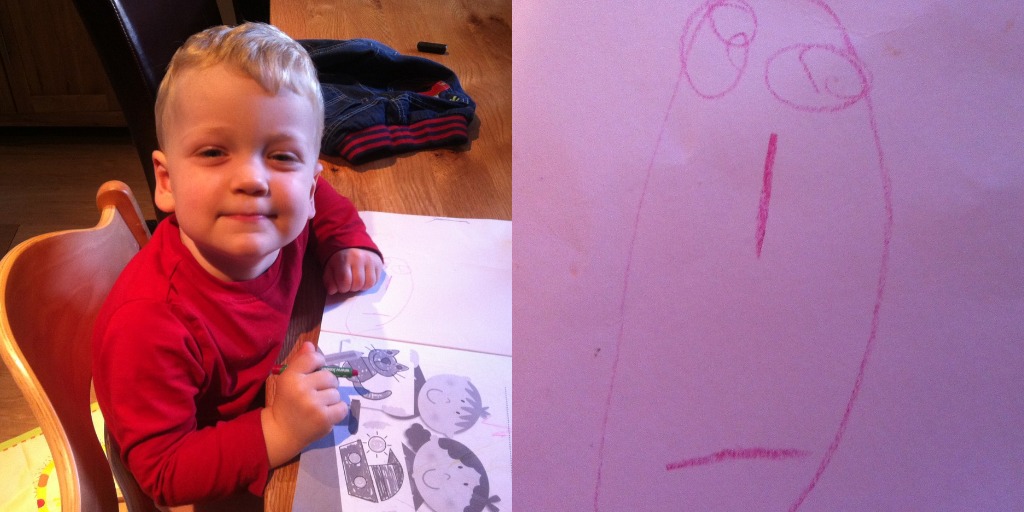 Now in playing this game at regular intervals over the past couple of months Burton has wanted to draw smiley faces himself. Now back in February for the Colourful Me meme which as doing the rounds on twitter I had to ask Burton to draw me and this is what he drew – well he was only 18 months back then!!
