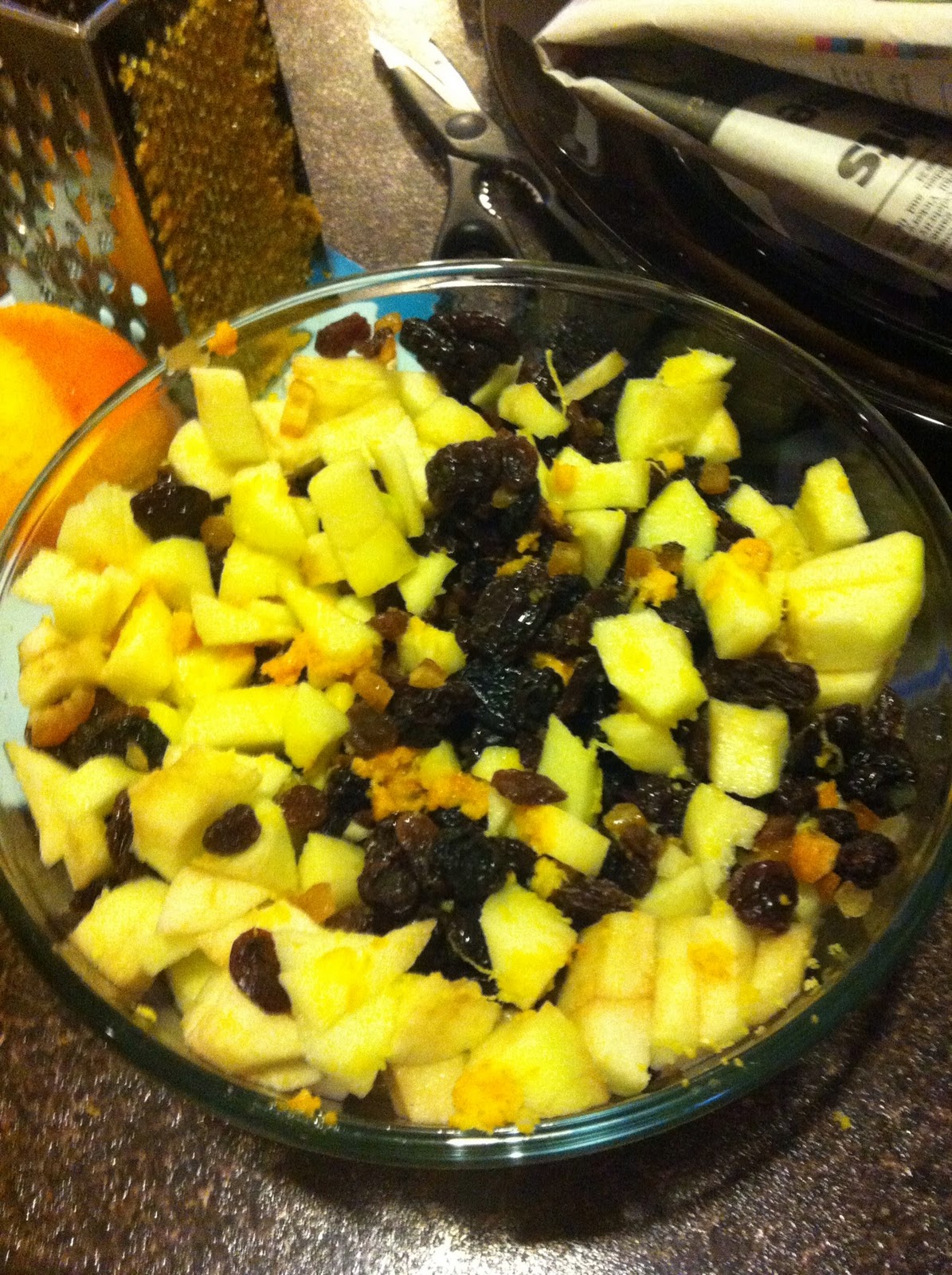 - Put the dried fruit, cherries, apricots, apple, zests, apple/orange juice, brandy (and Cointreau) in a large bowl. Microwave on High for 1 min, then leave to soak overnight.