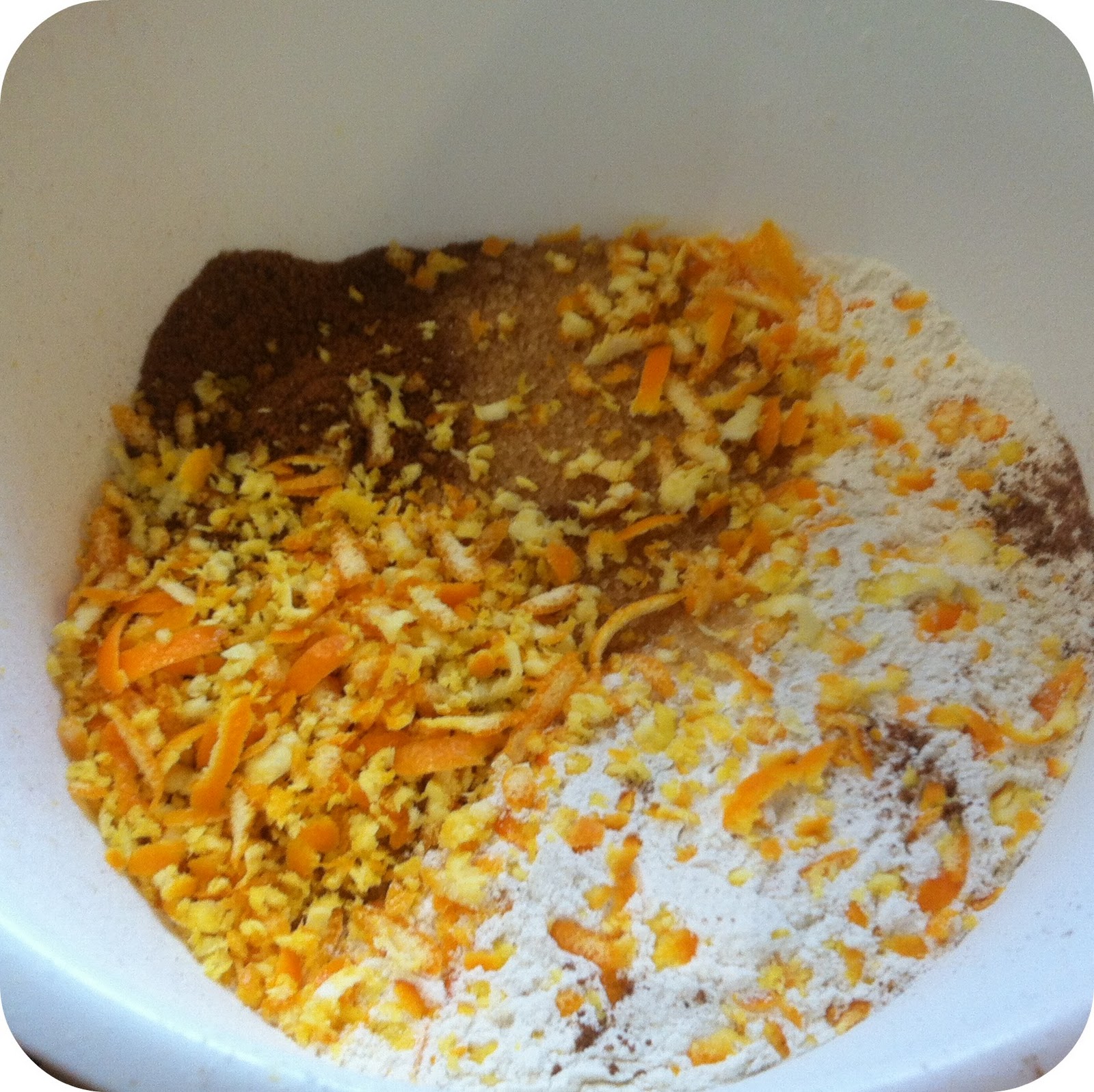 *place the flour, sugar, baking powder, mixed spice and zest in a