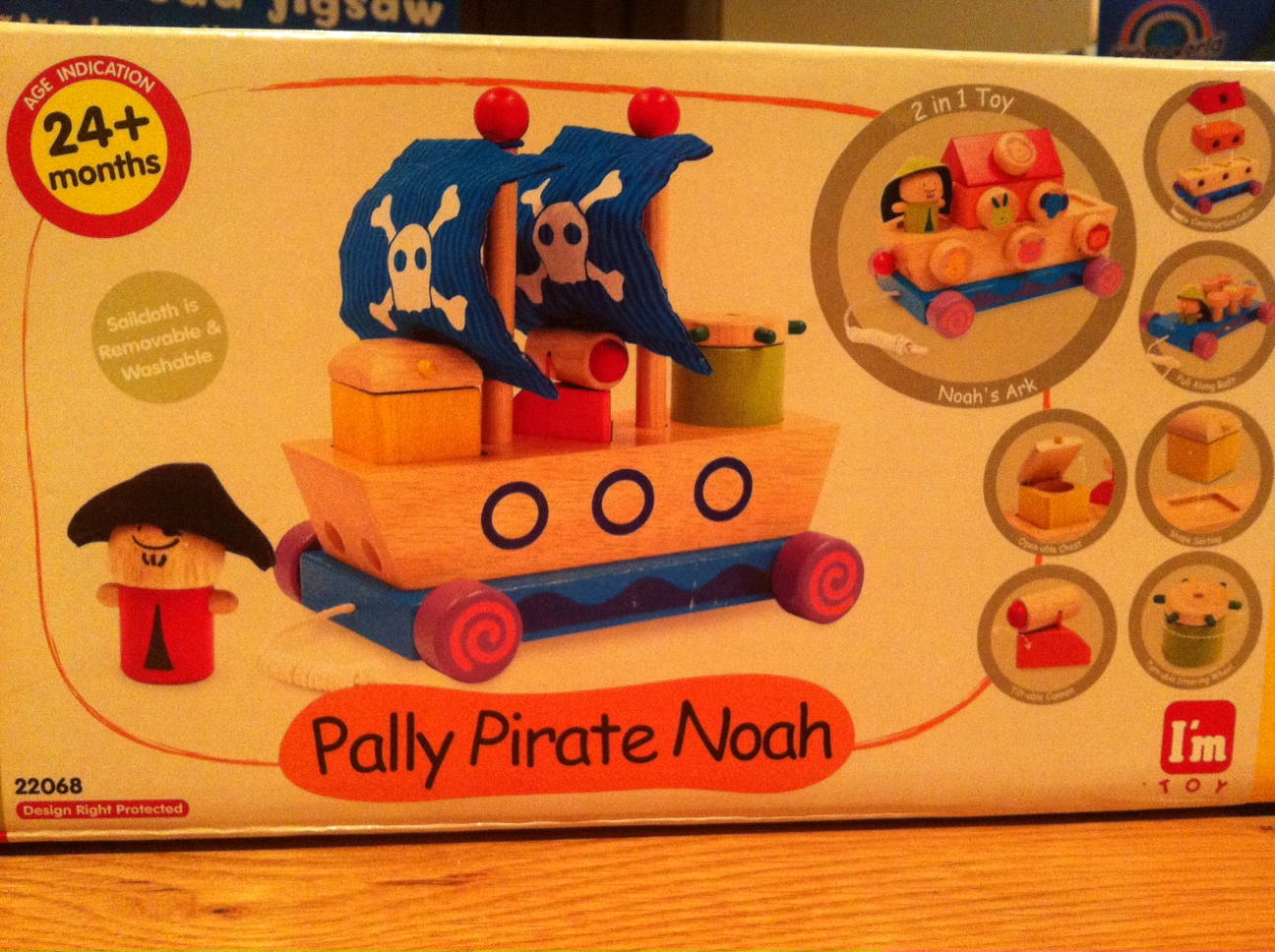 So firstly, this is made from wood which I am a big fan of (despite all the plastic toys we do have in the toy cupboards!). Secondly, it is 2 construction toys in 1, either a pirate ship or a noah’s ark can be made. The pirate ship come with 2 removable masts supporting the ships sails, a toilet canon, a turnable steering wheel, a chest which opens up and 3 sorting blocks. The noah’s ark on the other hand, comes with 6 sorting animal and a construction cabin. then its wooden base can also be used as a pull along raft for carrying Noah and his animals. This toy will really let Burton use his imagination (just hope we don’t lose any parts!)
