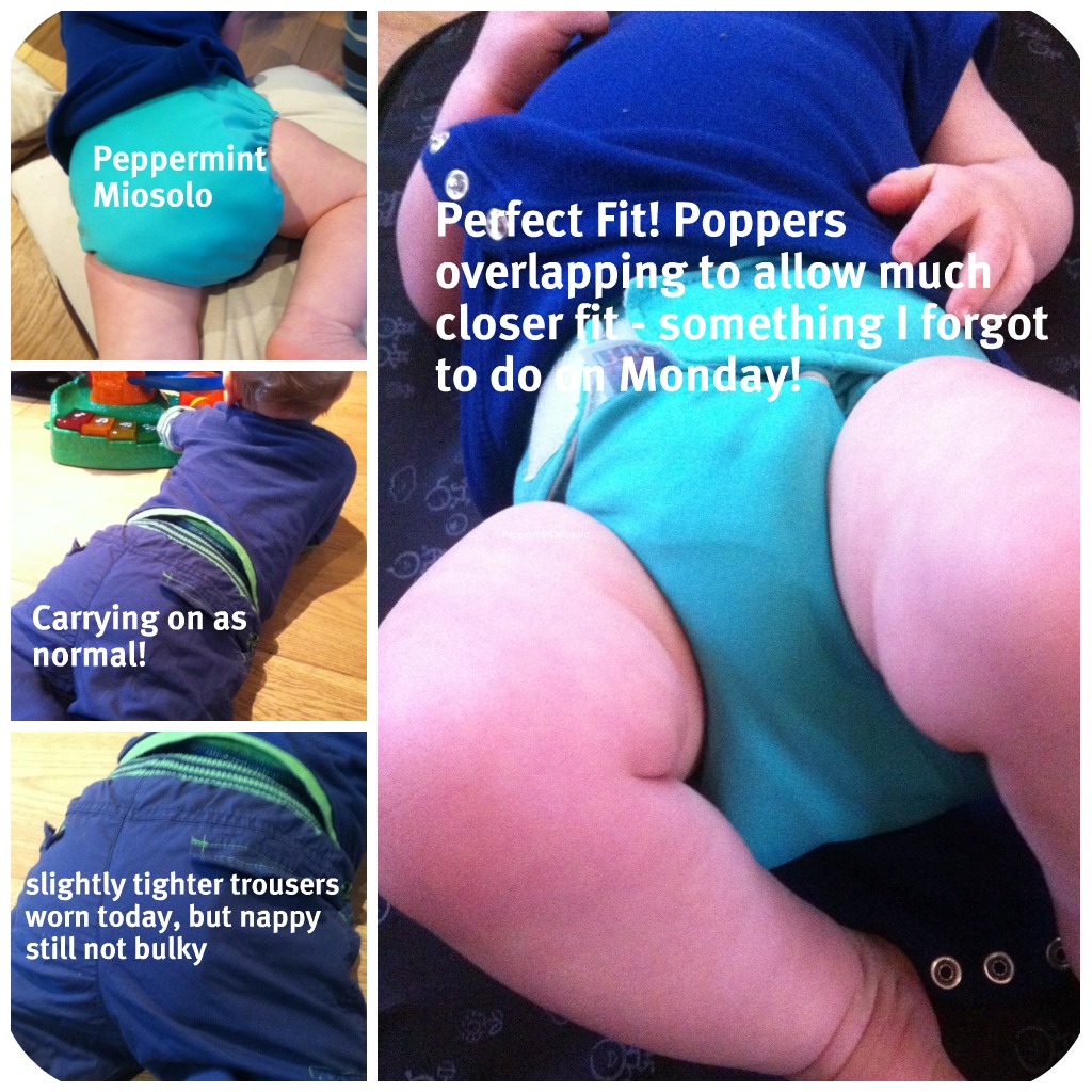 Yesterday I wrote about how the Miosolo had leaked a little during one of Jenson’s (extra) long naps, and although it didn’t put me off too much, after all even disposables leak from time to time, it did make me wary of having to monitor re-usable nappes more for ‘water’ content than I may have done with disposable for the same period of time (2-4 hours). However, it turns out that the ‘wee-gate’ incident may actually have been user error on MY part and not a problem caused by the Miosolo! I had forgotten that in order to make the nappy fit Jenson better and to be a more snug and less likely to leak fit, I needed to adjust the poppers on the front of the nappy! Doh!