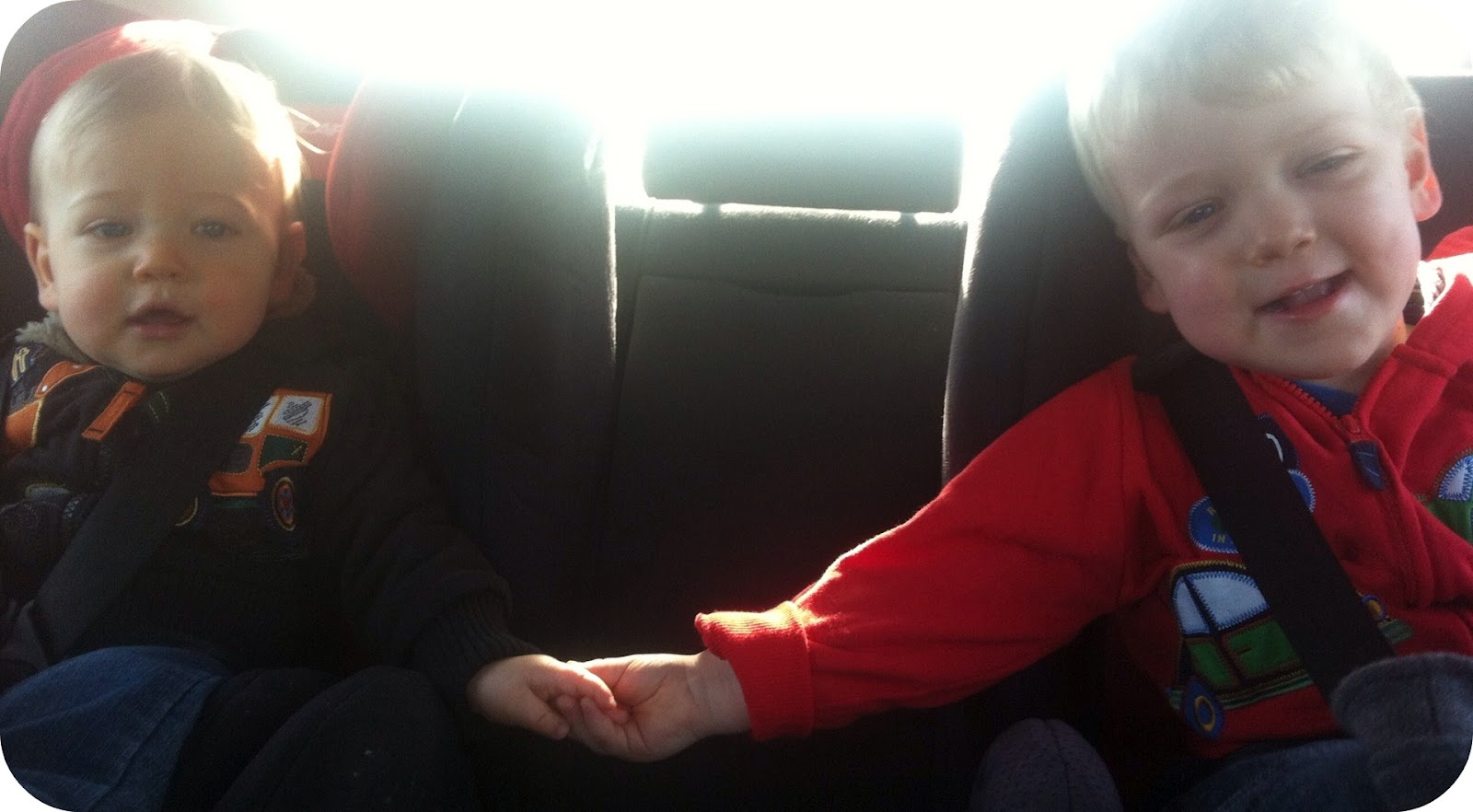 I love those pictures of them holding hands with their matching jackets and car seats! So adorable!