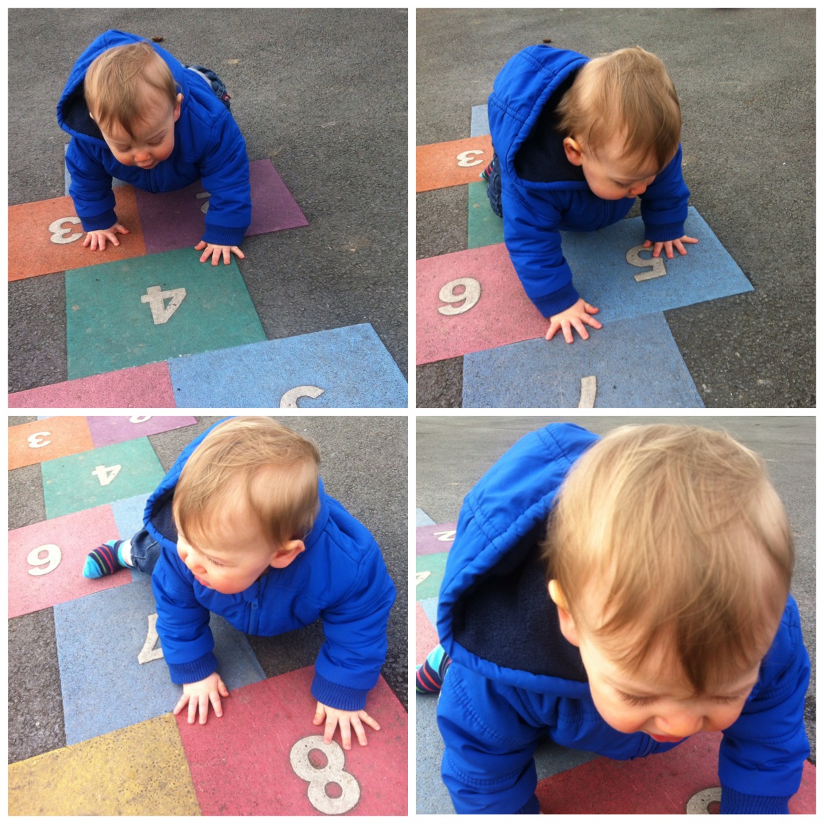 The hop scotch caught Jenson’s attention and he insisted on being allowed to explore it and he ended up crawling the length of the game!