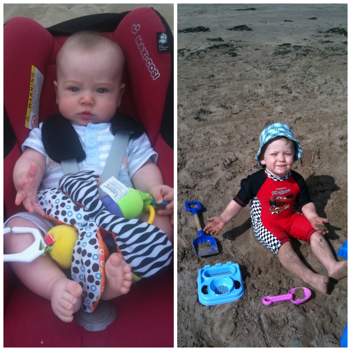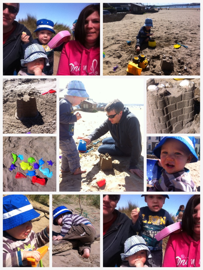 We awoke to a beautiful sunny and blue sky day so I suggested that we went to the beach today and Daddy agreed!! So I packed up a picnic and we got to Instow at 12pm. It was a little breezy but we found a spot that acted like a wind breaker and we set about tucking into our lunch! Due to him keep getting up and down Burton literally had some ‘sand’-wiches so he couldn’t eat much of his lunch. Not that he as bothered as he just wanted to play in the sand! The last time we went to the beach was last September when my boys looked like this