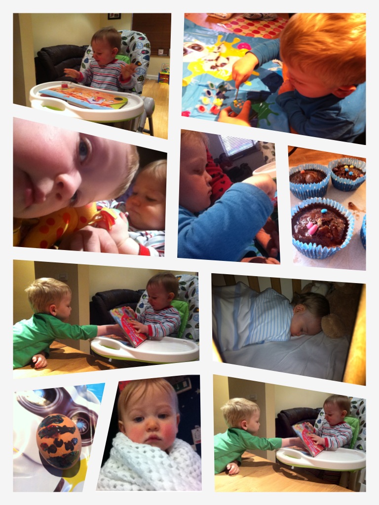 We couldn’t go out today because for one thing it was wet and Jon had taken the car for the day, and secondly we had to wait in for the plumber to come and fix our boiler (again!) as we had not had any hot water since Thursday last week! So we painted some eggs, played with the toys, made some cupcakes and watched some CBeebies.