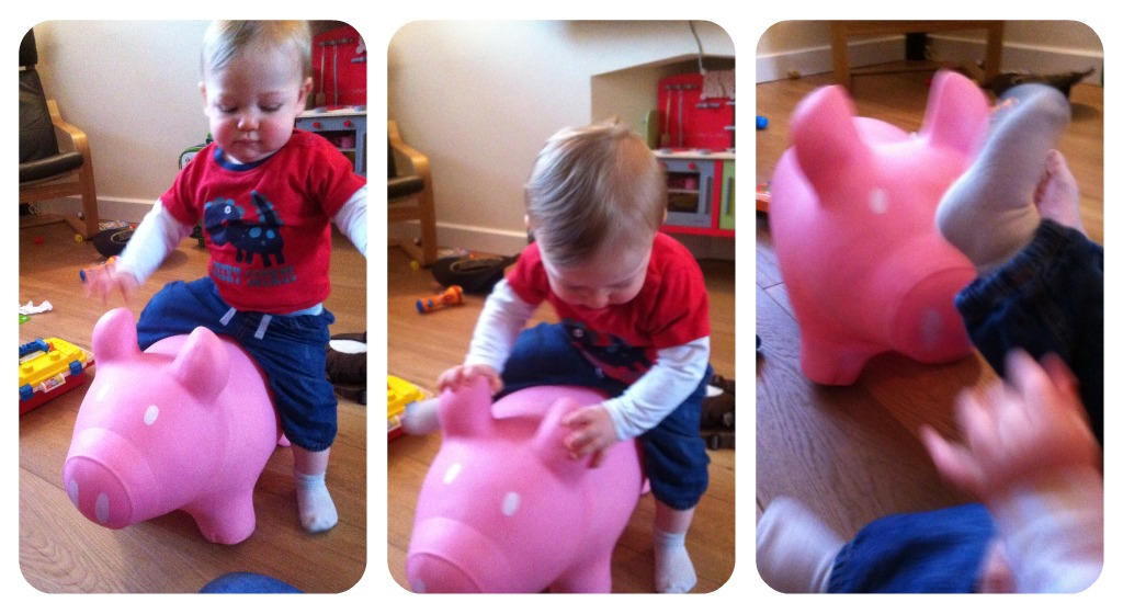Jenson tried it out first and fell off a few times but he absolutely loved sitting on top of the pig and moving his head up and down trying to bounce himself! It was very cute and funny to watch. He found it all very amusing and was chuckling away!