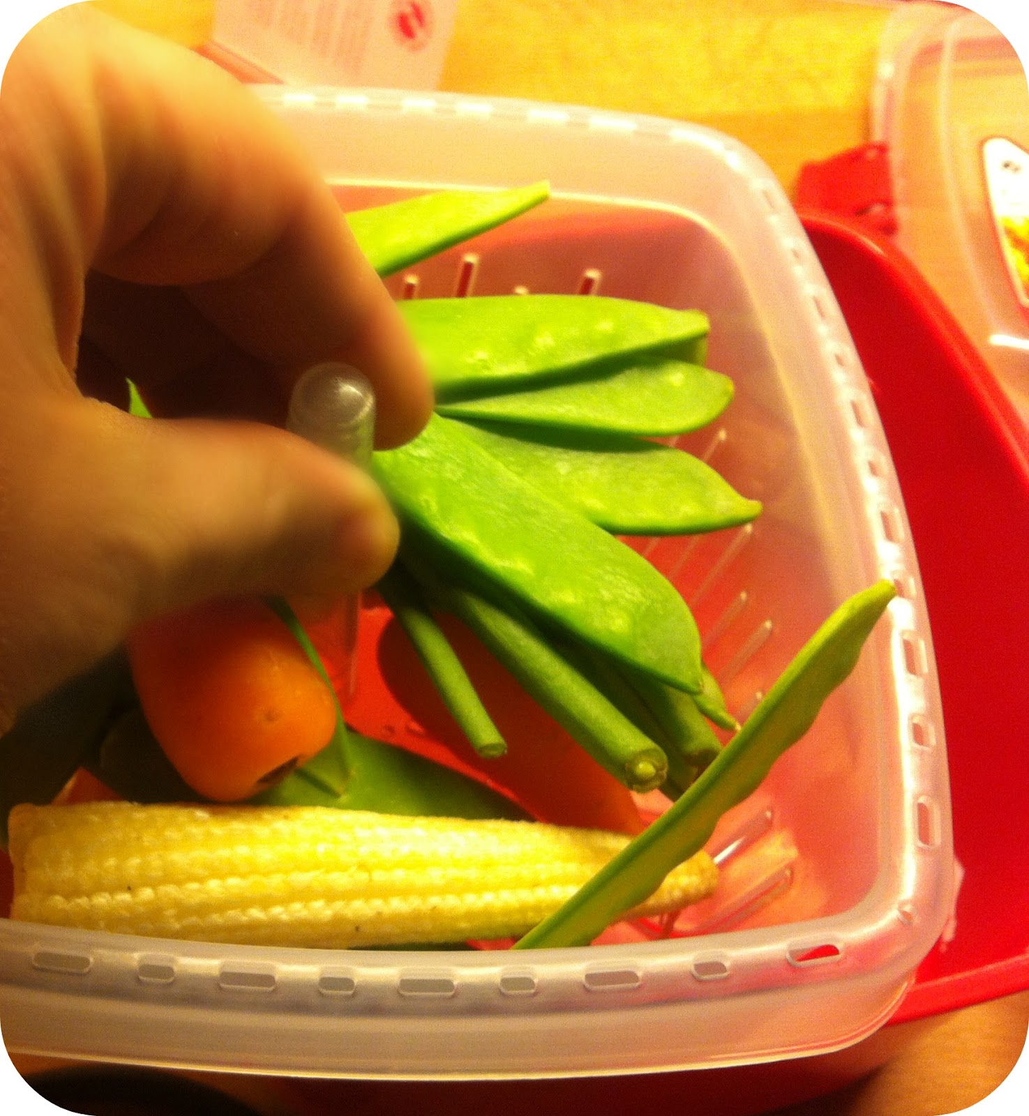 Add a little amount of water to the bottom of the medium microwave steamer, beneath the colander being careful to ensure that the food will be sitting in the water. Then place your vegetables into the colander tray and cook for as long as needed. In the case of my baby vegetables 3 1/2 minutes