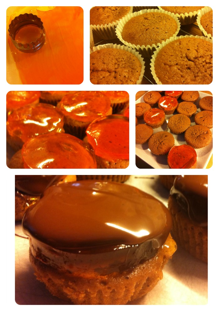 - Once melted leave on the side and remove the jelly from the fridge. Remove the grease proof paper topped jelly from its dish and lay on a chopping board. Using a small pastry cutter, cut out rounds of jelly and place one on each cupcake. If your cupcakes don't have a flat top, then very carefully remove a disc from the top of the cake to make it so. Then add your jelly disc.
