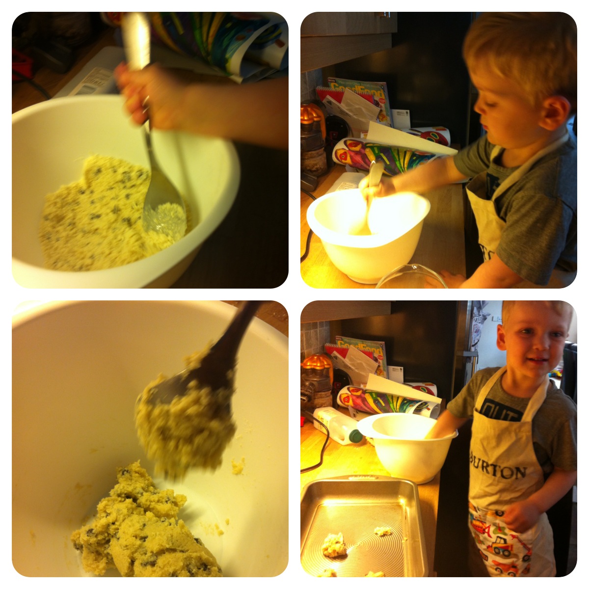 I wanted to make some cookies with Burton so that we could link up to Helen’s linky. Knowing that it would probably only be me who ended up eating them afterwards, I didn’t want to make a large batch so if you wanted to make more than 6 just double or triple the quantities to make the amount you require.
