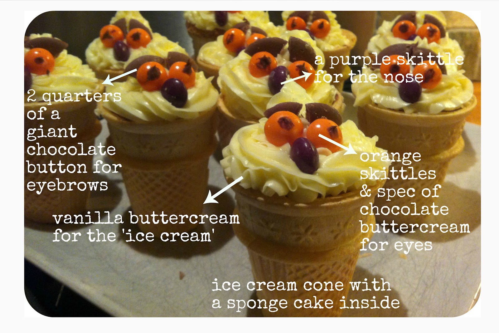 using the ice cream cone cupcake recipe that I posted here I then decorated each cone as follows