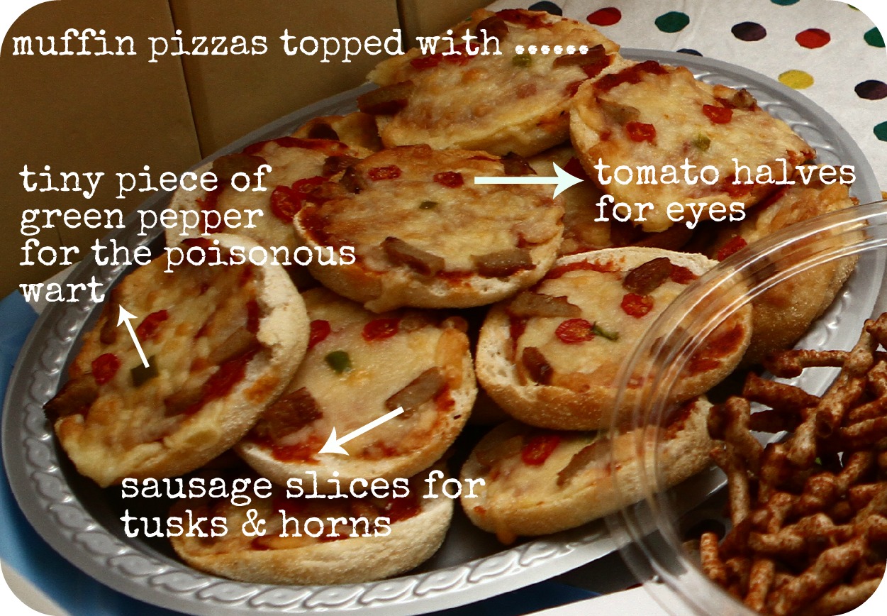 rather than make actual pie, I made mini muffin pizza’s instead as I thought these would appeal to children more. Again, I tried to decorate each one with a gruffalo face as shown below