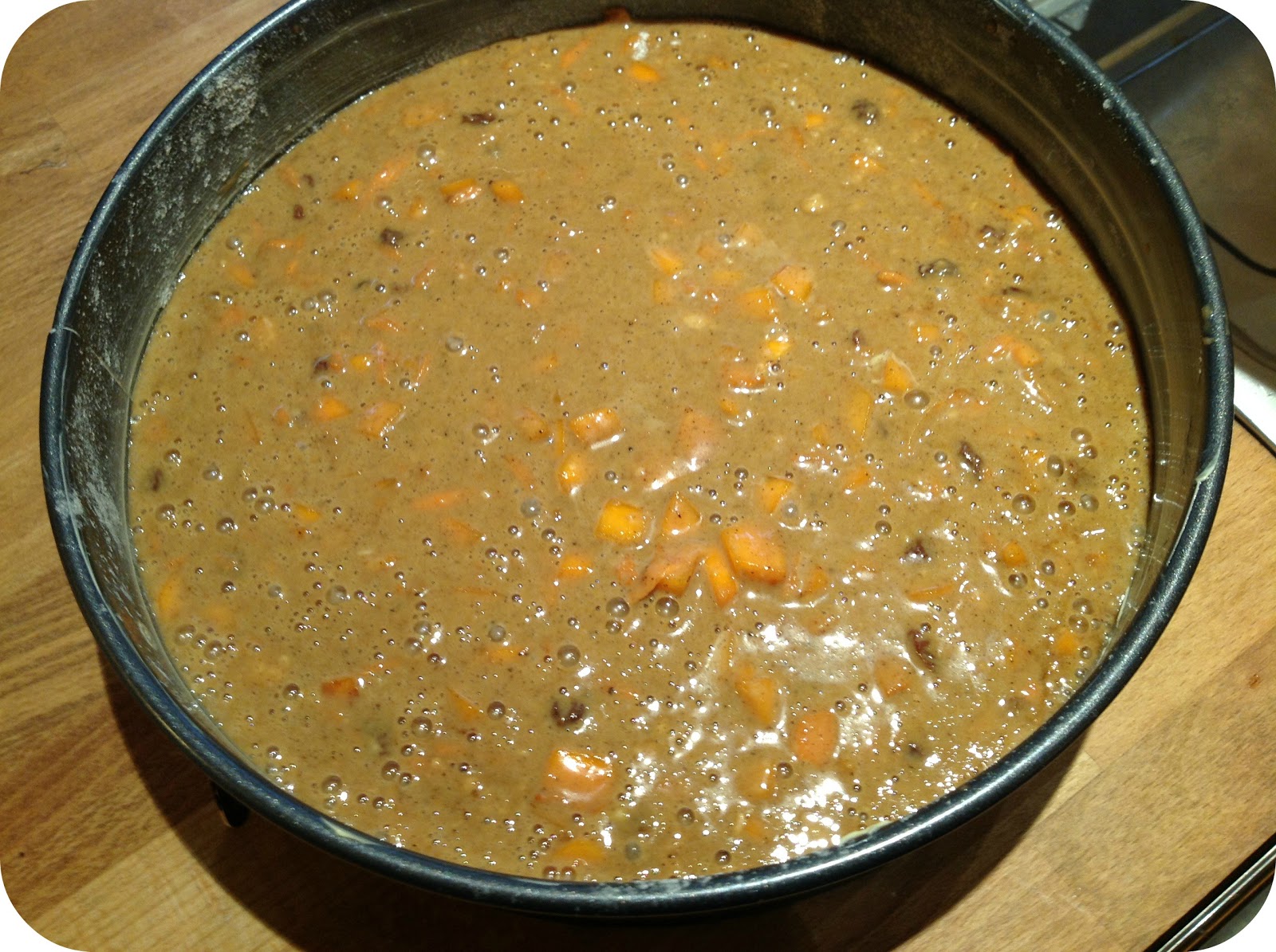 Add the soaked sultanas and pumpkin/squash – a little bit of liquid will enter the mix which is ok but not too much else the cake batter will be too wet