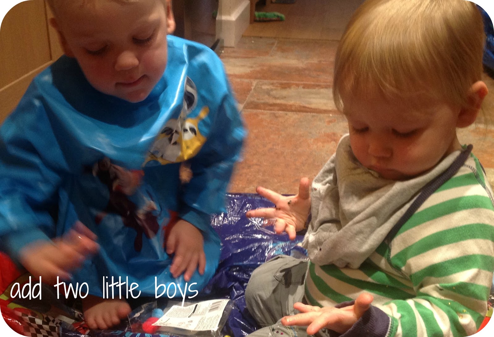Inspired by a Domestic Goddesque post I found via a vlog last Friday by Karin on google + hangout, I decided to let the boys have a go after a fraught day at home Sunday when it rained all day and we were stuck at home without a car.