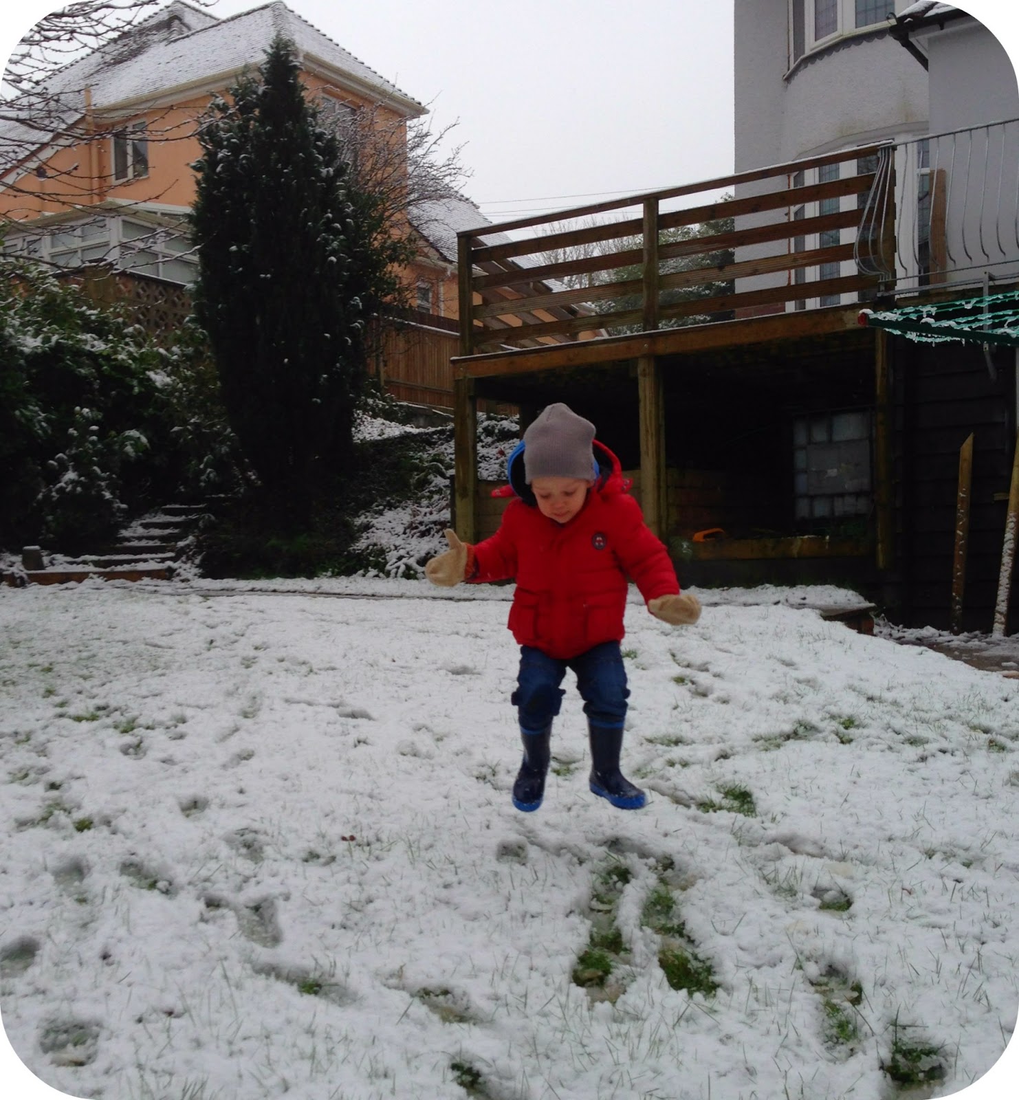 We awoke to some snow this morning – not a lot and certainly not enough to build a snowman but still enough to warrant a trip into the garden to make foot and hand prints and get some fresh air. Here is Burton jumping in the snow.