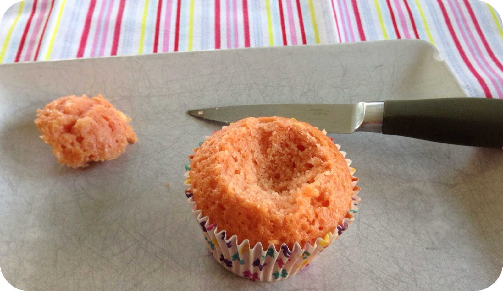 Once the cakes are completely cooled down, remove a small circle, about 2.5cm width, from the top centre of each cake