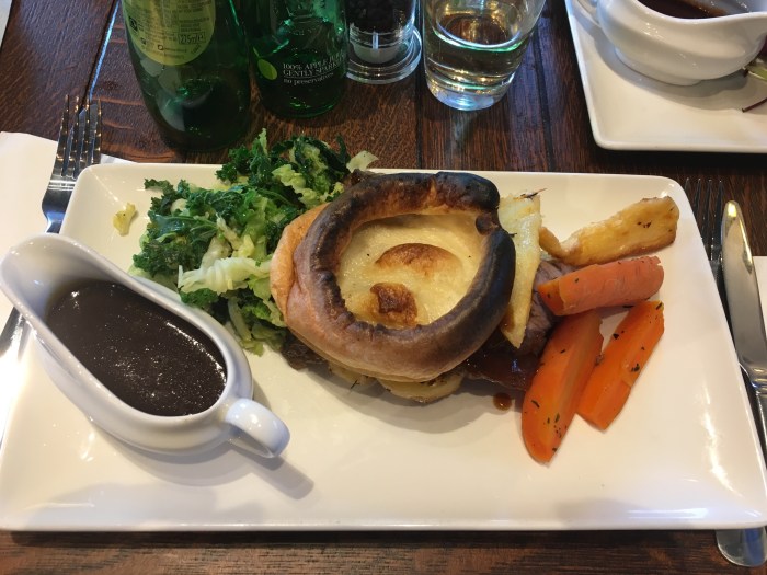 For the main meal, I went with the Roast sirloin of beef (served with Yorkshire pudding, ruffled roast potatoes, honey & thyme roasted carrots, roasted parsnips, seasonal greens and as much gravy as you like), and I adore the fact that you get a little gravy boat on the side. This was a very tasty roast dinner, and the beef was especially succulent and I liked that it was not pink or red, just brown.