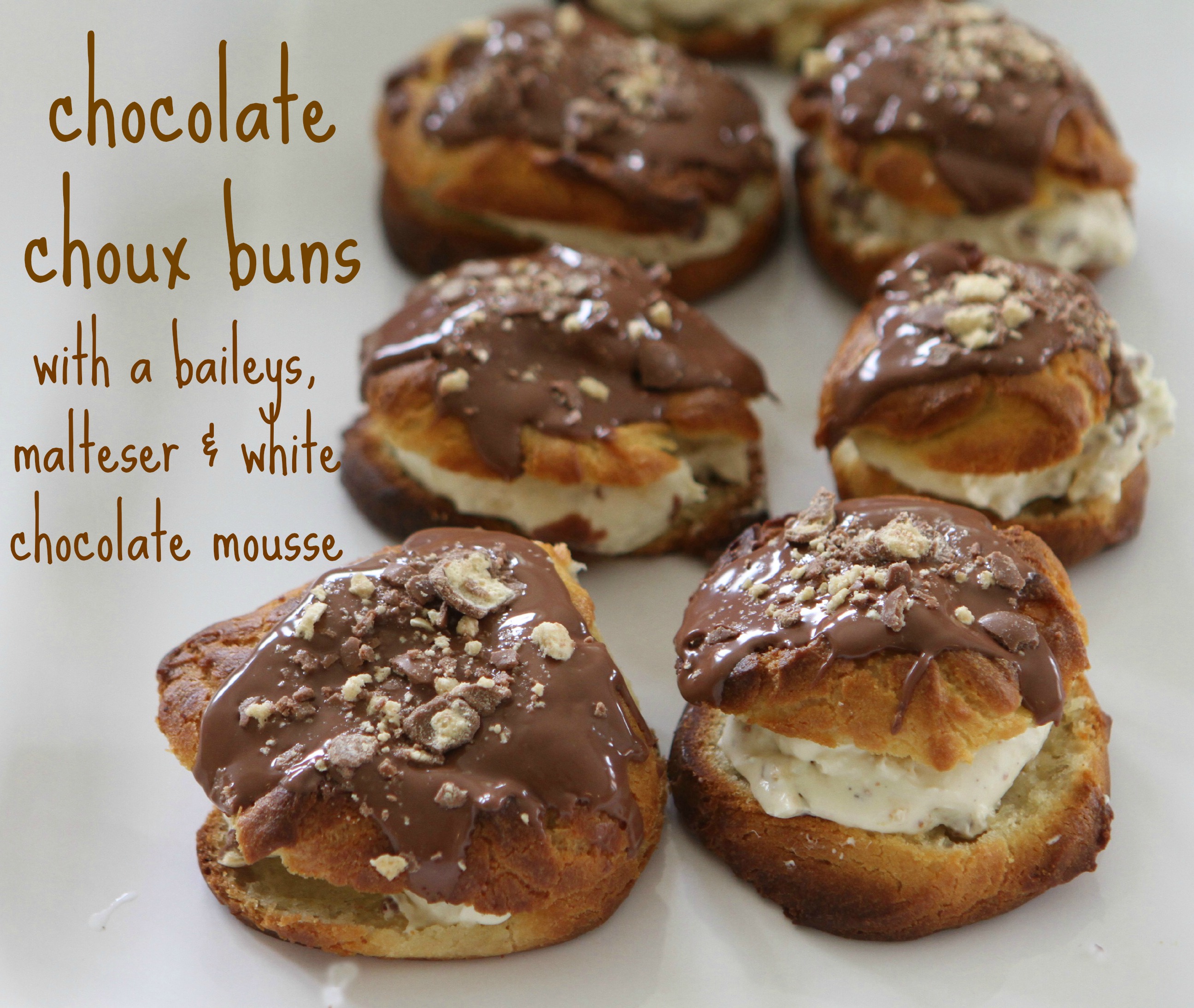 Chocolate Choux Buns with a baileys, malteser & white chocolate mousse