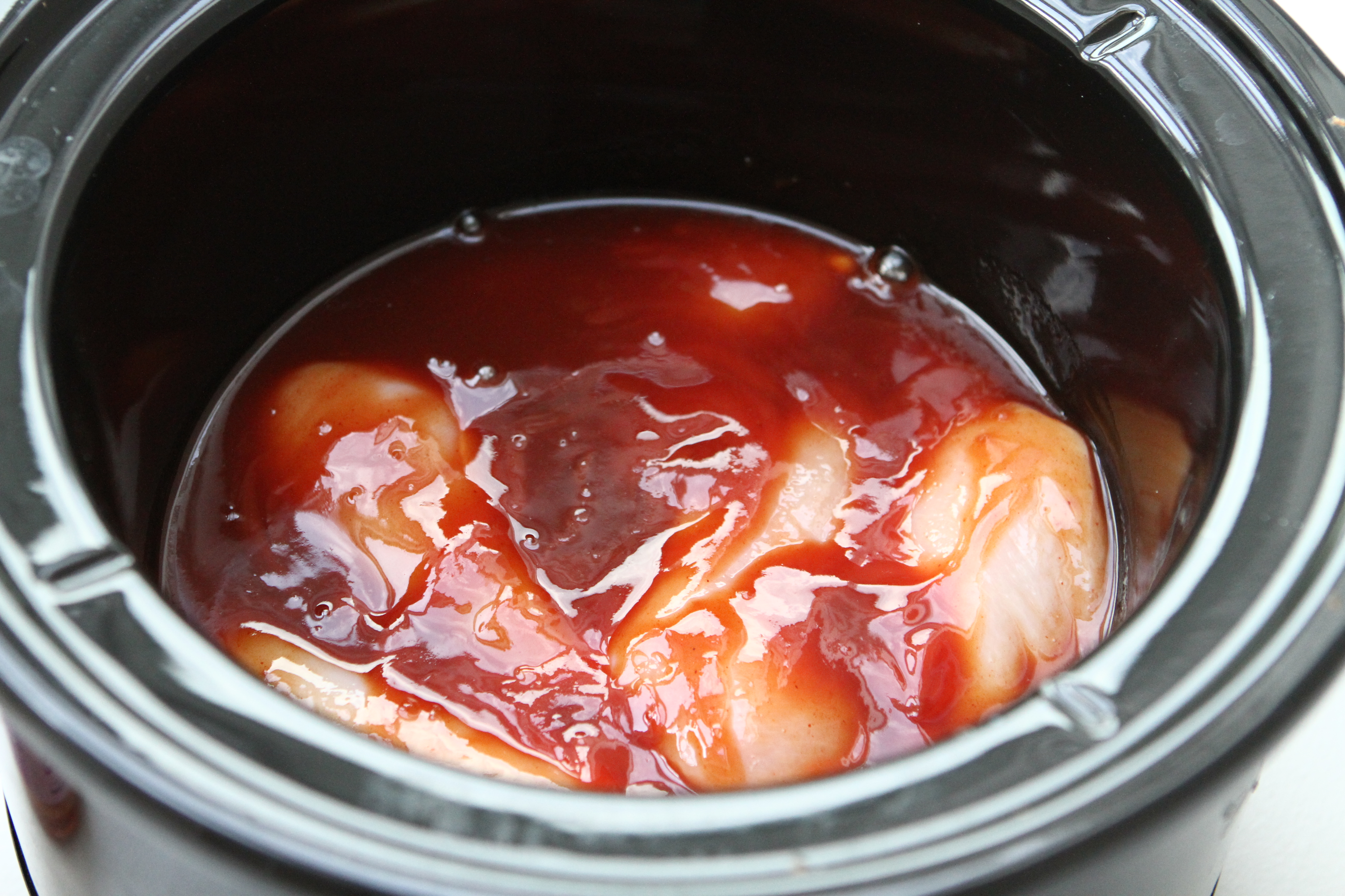 - place the chicken and the entire contents of the sticky BBQ sauce in to your crock pot/slow cooker