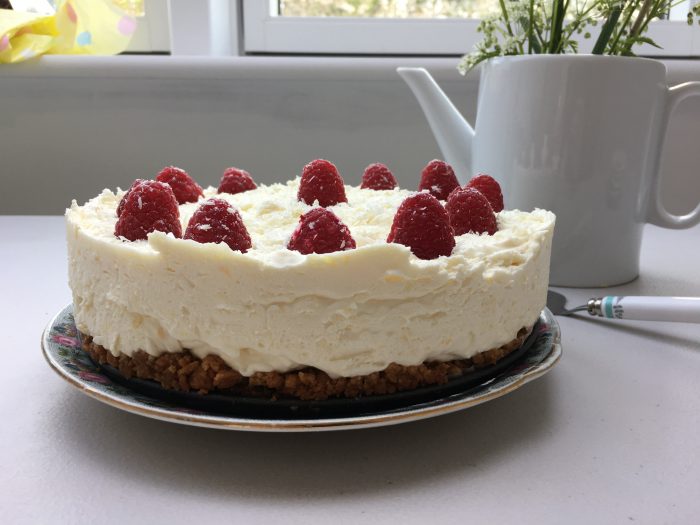 - Mix biscuits and butter together and press down into a greased and lined loose bottomed cake tin and allow to cool completely.