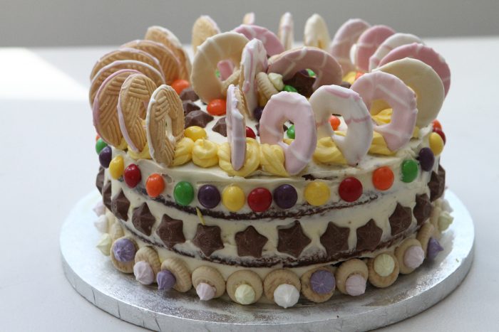Keeping back about 2 tbsp of the vanilla frosting, with the rest of it cover the entire cake so that it is completely covered in the frosting. Smooth it over with a palette knife. Then with there left over frosting, add a little yellow food colouring and mix well. Pour it into a piping bag and pipe little swirls all around the outer circumference of the cake and along the bottom. Now decorate your cake as per my design (if you like - or as you like of course!)