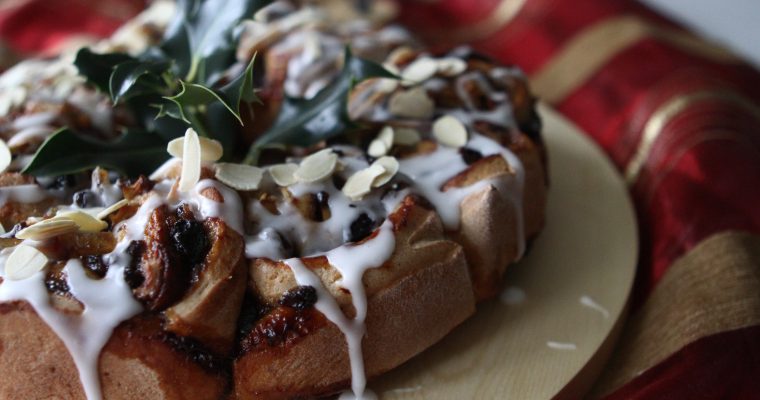 Make your icing fairly thick and place it in to a piping bag (or you could just use a spoon to drizzle if you prefer), and pipe all over the wreath generously. Add some flaked almonds and a spit of holly (optional) for a final festive flourish.
