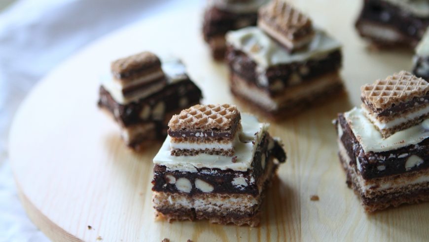 Once cold, pour melted white chocolate over the top ad spread it on evenly. Then top with small pieces of the Knoppers as per my photo.