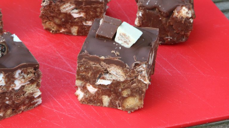 Melt the chocolate and then pour over the rocky road base, top with the leftover KitKats and leave to cool and set