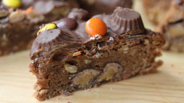 Once, cold, remove the brownie, and cover with the melted chocolate and decorate with the remaining Reese's chocolates.
