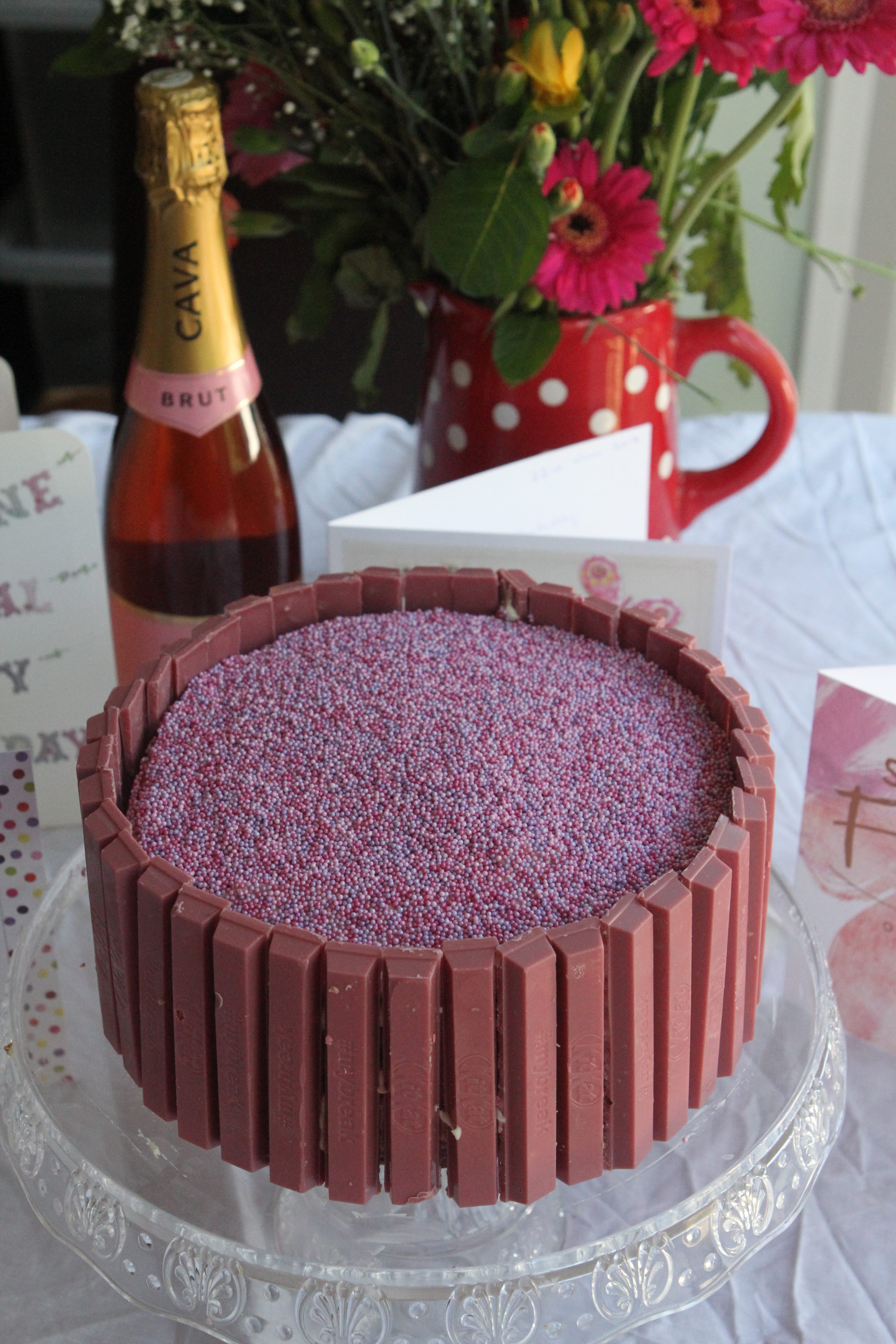 - stick the KitKats (which will need to be broken into single fingers) around the cake