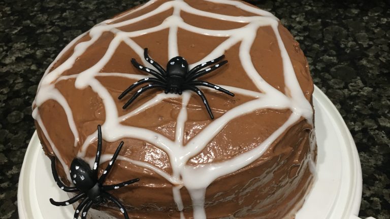 Now pipe a cobweb design onto your cake. Then add some plastic spiders.