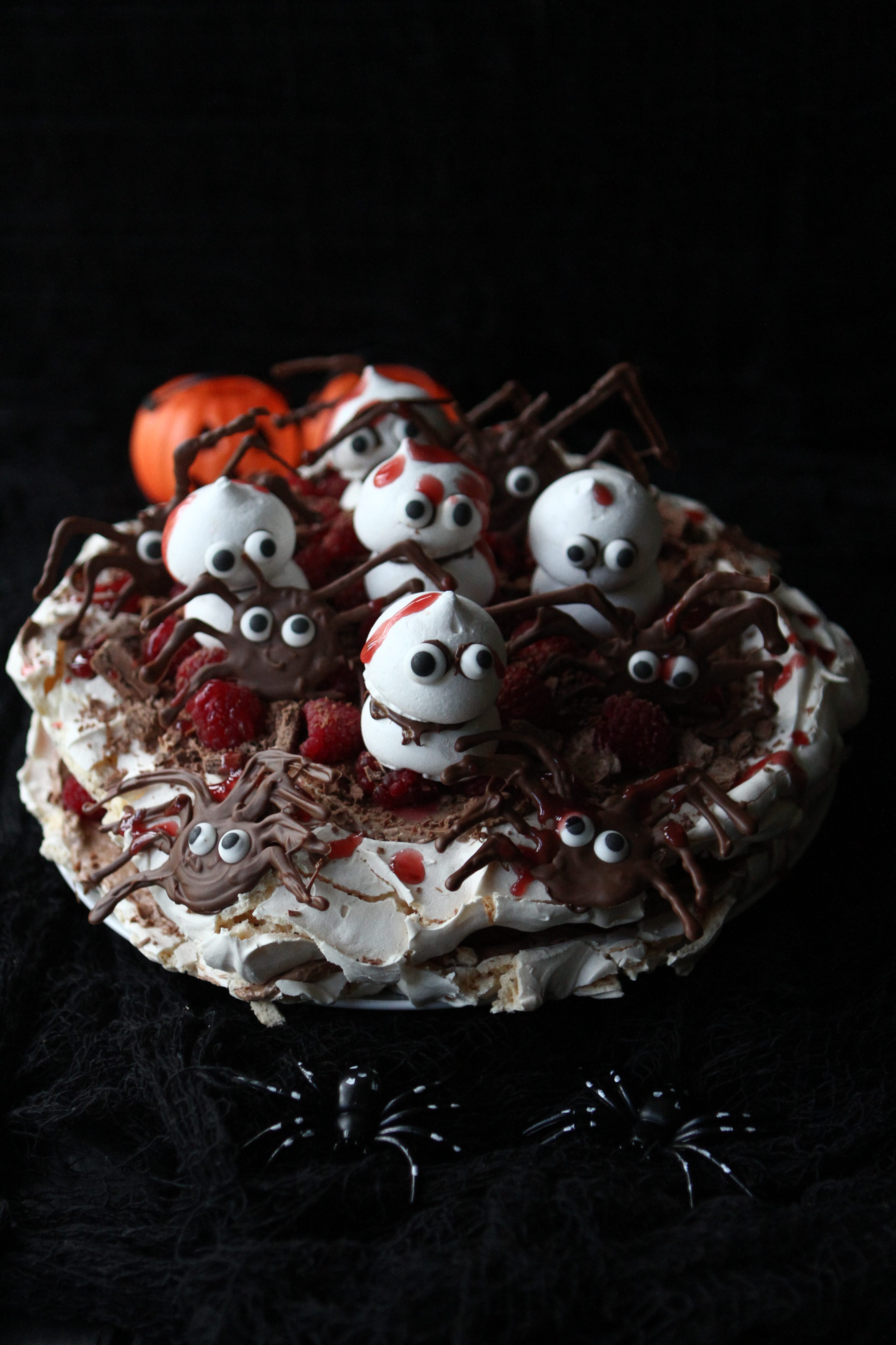 Now sit your meringue ghosts and chocolate spiders on the top of your pavlova and splatter some more of the coulis over the top.